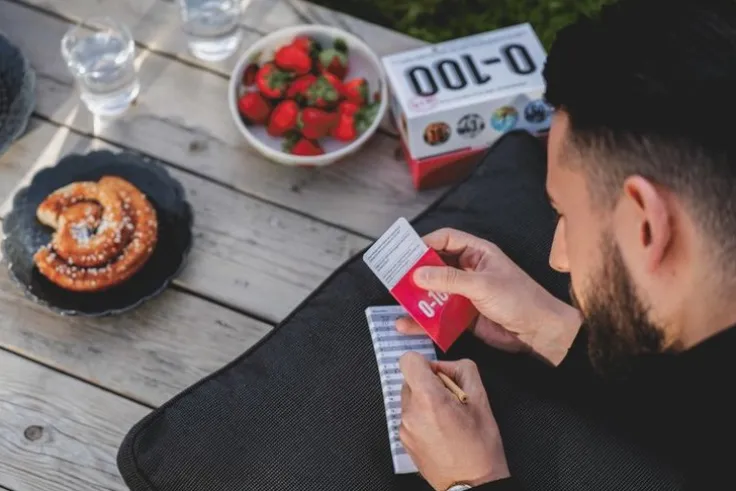 Här är spelet där ingen längre behöver sitta utan att ha ett svar! Mini 0-100 är succespelet i en liten kartong fylld med roliga och aktuella frågor. Svaret är alltid är ett tal mellan 0-100. Här får spelarna tänka brett och fritt utifrån sina kunskaper och erfarenheter. Väger endast 66 gram och är superlätt att packa med och det är enkelt att spela. Tillverkad i Sverige av Playmig. Innehåll: 175 frågor, poängblock, spelkortsficka och regler. Spela 2- flera spelare. Eller spela i lag. Speltid från 10 min
