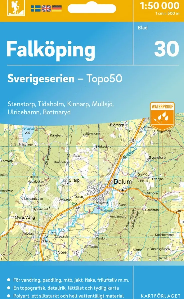 Sverigeserien är en kvalitetskarta som är gjord för att användas! Aktuellt kartdata är hämtat från Lantmäteriet och den är tryckt på Polyart som är helt vattentåligt och slitstarkt. Det mjuka materialet tål att vikas om och om igen. Den klarar både vinterns och sommarens ibland utmanande väder i Sverige. Kartorna har en utförlig teckenförklaring på svenska, engelska och tyska.