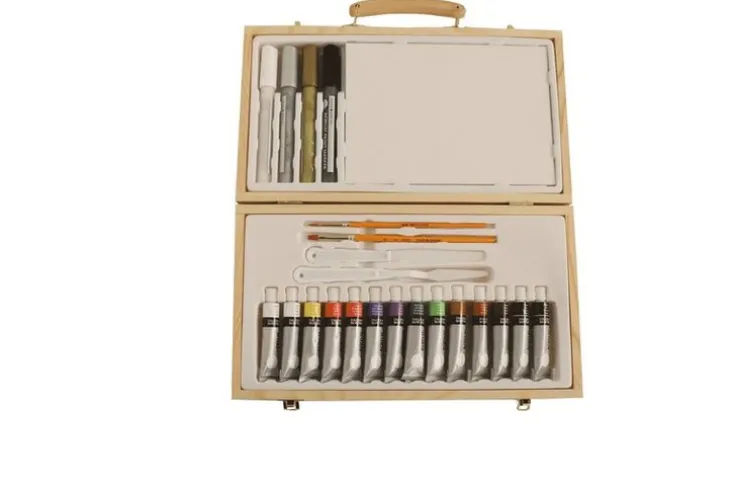 Prisvärt målarset från Daler Rowney, ett perfekt startset för den som önskar komma igång med att måla med akrylfärger. I den praktiska träväskan ryms allt som behövs: 14 tuber med akrylfärg som har hög ljusäkthet och kan användas på många ytor, 2 penslar, 4 akrylpennor, 2 palettknivar, 1 palett, 2 pannåer samt 1 färgblandningsguide. Allt kommer i en gedigen träväska med metallbeslag.