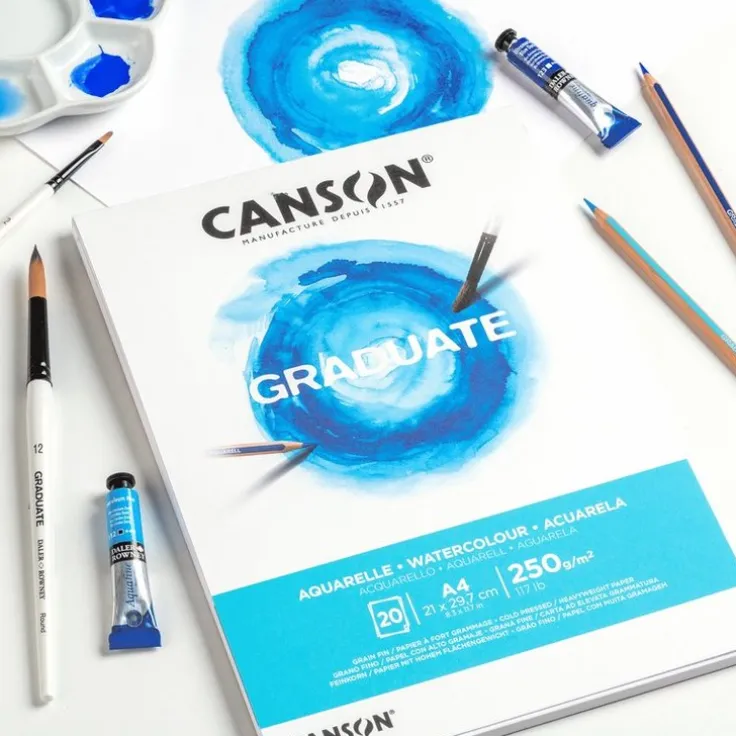 Canson® Graduate Akvarellblock i A4 formatinnehåller 20 ark 250 g/m2 vitt, slitstarkt papper i fin gräng. Den är perfekt för akvarellmålning. Syrafritt och FSC-certifierat papper tillverkat i Frankrike.