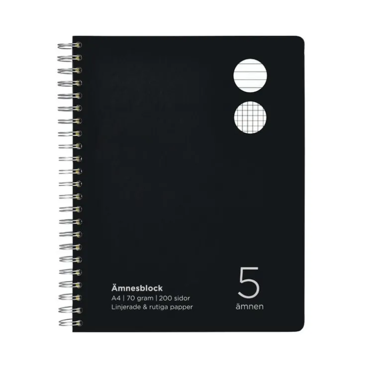 5-ämnesblock i A4-format. Blocket har 200 sidor, Omslag i kartong och fem avdelare med synlig flik i kartong. Tre av avsnitten har linjerade blad, resterande två har rutade blad.70 g linjerat och rutat papper.Miljömärkt.Ett anteckningsblock i smidigt format som lätt ryms i väskan. Passar perfekt för elever med många ämnen att hålla reda på samtidigt. Ingår i Akademibokhandelns egen kollektion – Kollektion Stora A.