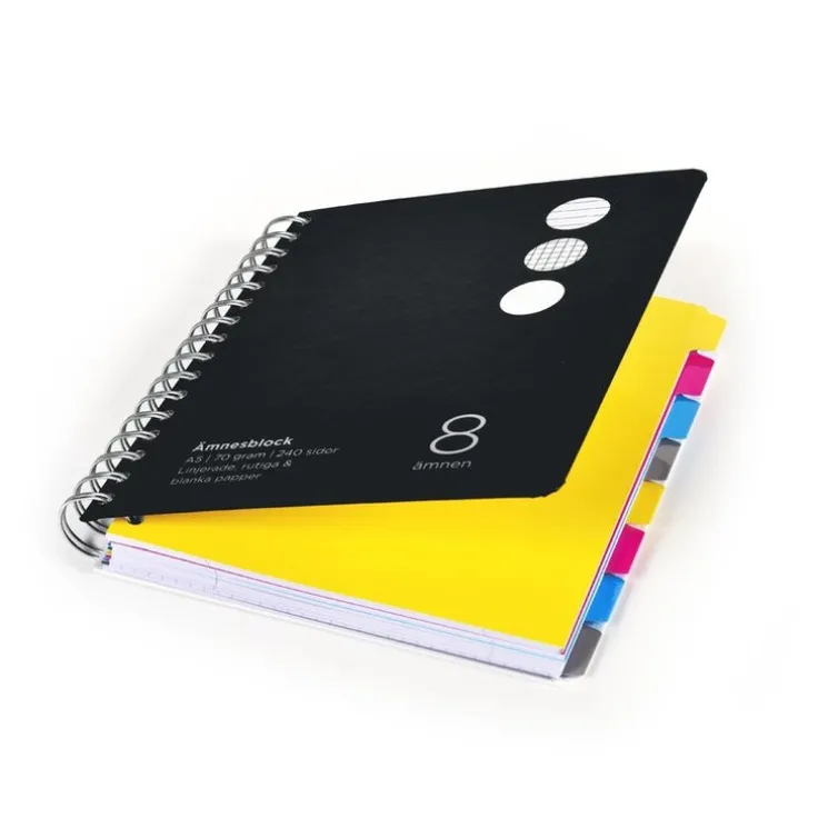 8-ämnesblock i A5-format. Blocket har 240 sidor, Omslag i kartong och åtta avdelare med synlig flik i kartong. Sex av avsnitten har linjerade blad, resterande två har rutade respektive blanka blad.70 g linjerat, rutat och olinjerat papper.Miljömärkt.Ett anteckningsblock i smidigt format som lätt ryms i väskan. Passar perfekt för elever med många ämnen att hålla reda på samtidigt. Ingår i Akademibokhandelns egen kollektion – Kollektion Stora A.