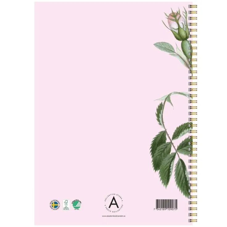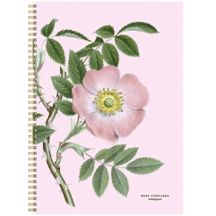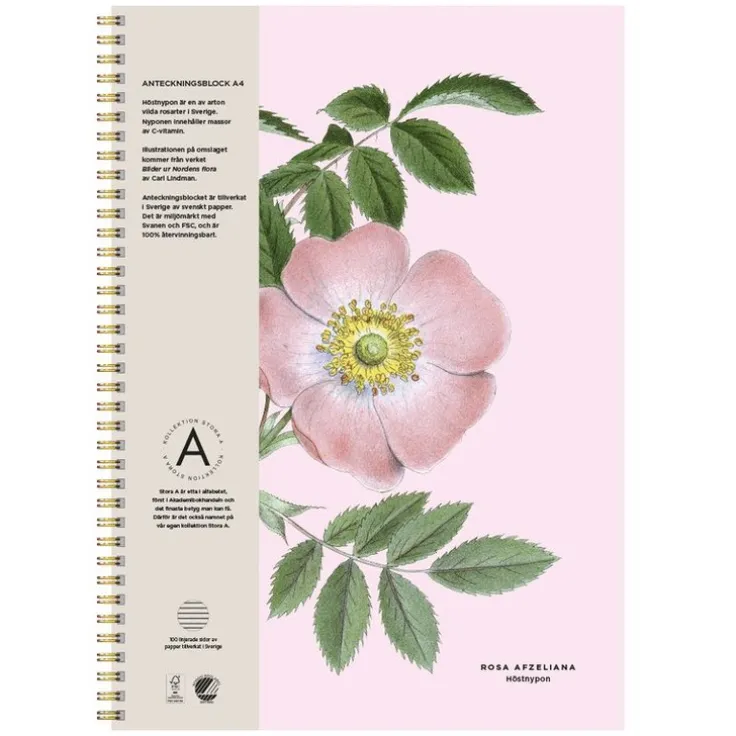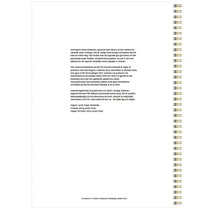 Om anteckningsblockets motiv: Höstnypon (Rosa afzeliana), nyponros eller törnros är den största vilt växande rosen i Sverige. Den är vanlig i hela Europa och busken kan bli hela tre meter hög. Förr trodde man att nyponet gav god sömn om det placerades under kudden, så kallad törnrosasömn. Motivet på anteckningsblockets framsida är hämtat ur professor Carl Axel Magnus Lindmans stora verk Bilder ur Nordens Flora som gavs ut för första gången 1901.