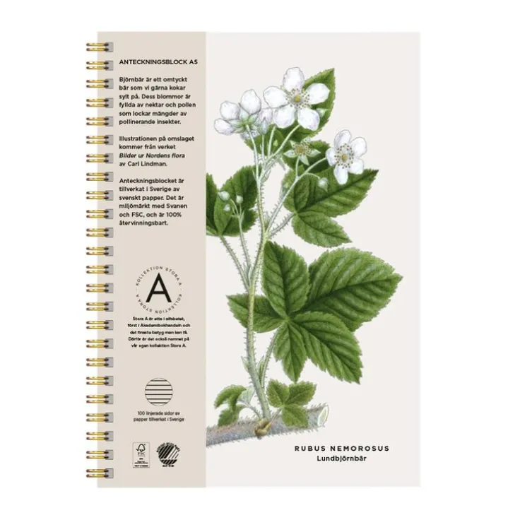 Om anteckningsblockets motiv: Lundbjörnbär (Rubus Nemorosus) växer vilt i hela Skandinavien och förekommer främst i de södra delarna av Sverige. Dess rosavita blommor är fyllda av nektar och pollen som lockar mängder av pollinerande insekter. Björnbärsblad har länge använts inom folkmedicin för dess läkande egenskaper, både för invärtes och utvärtes bruk. Den vackra illustrationen på det här blockets framsida är tagen ur professor Carl Axel Magnus Lindmans stora verk Bilder ur Nordens flora, som gavs ut för första gången 1901.