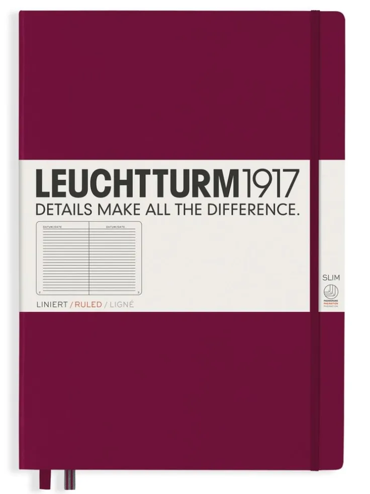 Leuchtturm1917 A4 Slim är en trådbunden linjerad anteckningsbok något större än A4, så att lösa A4-ark får plats mellan sidorna utan att sticka ut. Anteckingsboken har 121 sidor och ink-proof syrafritt 100 g/m2 papper. Längst bak finns en ficka för förvaring. Boken har två märkband och ett elastiskt band som håller ihop boken. Klistermärken för märkning och arkivering medföljer. Färg: Port Red