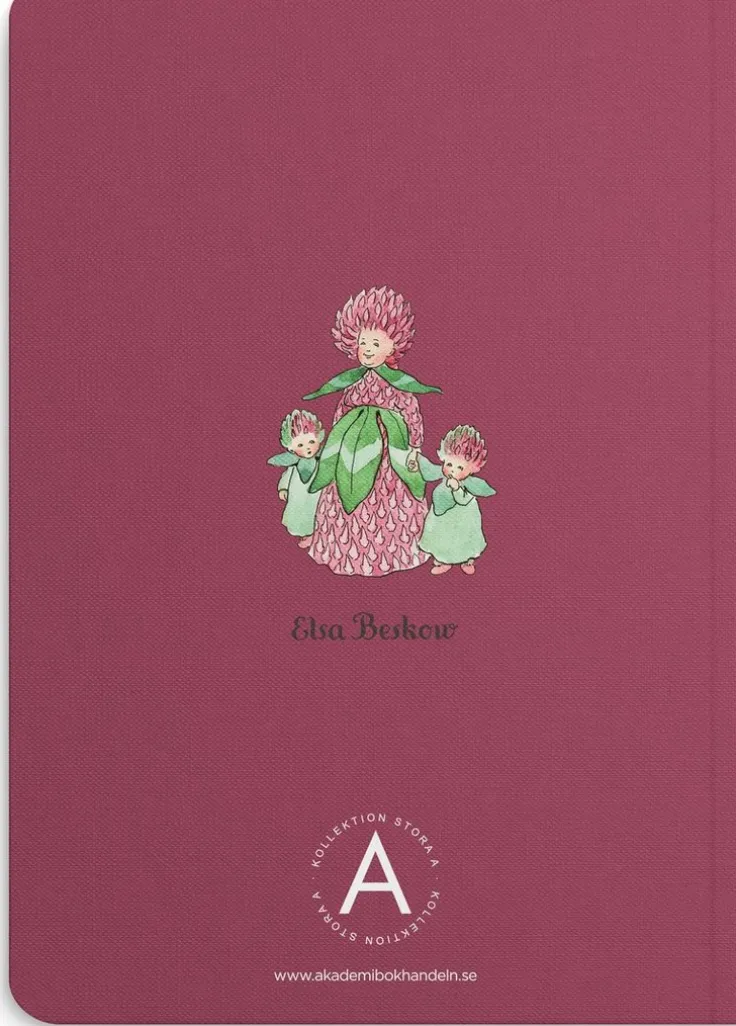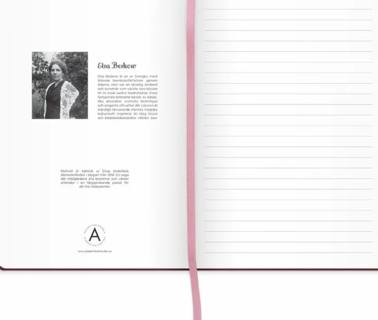 Inbunden skrivbok med vinrött omslag, 128 linjerade sidor och ett praktiskt märkband. Motivet är hämtat ur Elsas Beskows bilderbok Blomsterfesten i täppan från 1914. En saga där trädgårdens alla blommor och växter anländer i en färgsprakande parad för att fira midsommar. A5-format80 g linjerat papperFSC®-märkt papper, ett bättre val för dig och vår världElsa Beskow är en av Sveriges mest älskade barnboksförfattare genom tiderna. Hon var en skicklig skribent och konstnär som väckte sina böcker till liv med vackra illustrationer. Elsas fantasifulla bildvärld består av detaljrika akvareller, svartvita teckningar och eleganta silhuetter där naturen är ständigt närvarande. Hennes magiska kulturskatt inspirerar än idag läsare och bilderbokskonstnärer världen över. Nu i ett unikt samarbete med Akademibokhandeln för vår egen kollektion – Kollektion Stora A.