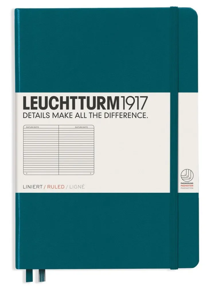 Leuchtturm1917 A5 är en trådbunden linjerad anteckningsbok med 251 sidor och ink-proof syrafritt 80 g/m2 papper. Längst bak finns en ficka för förvaring. Boken har två märkband och ett elastiskt band som håller ihop boken. Klistermärken för märkning och arkivering medföljer. Färg: Pacific Green