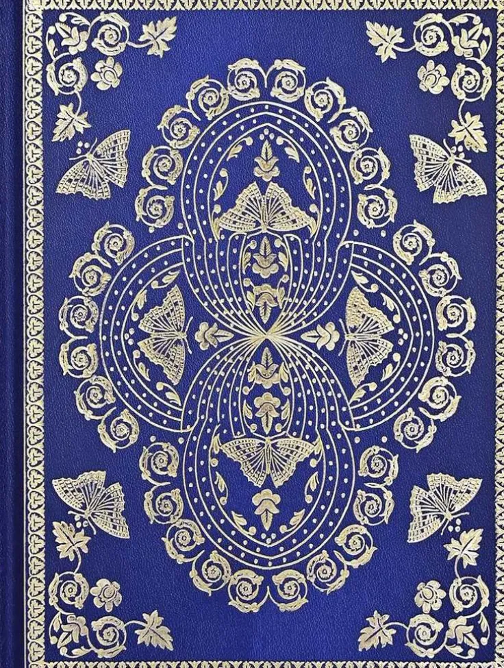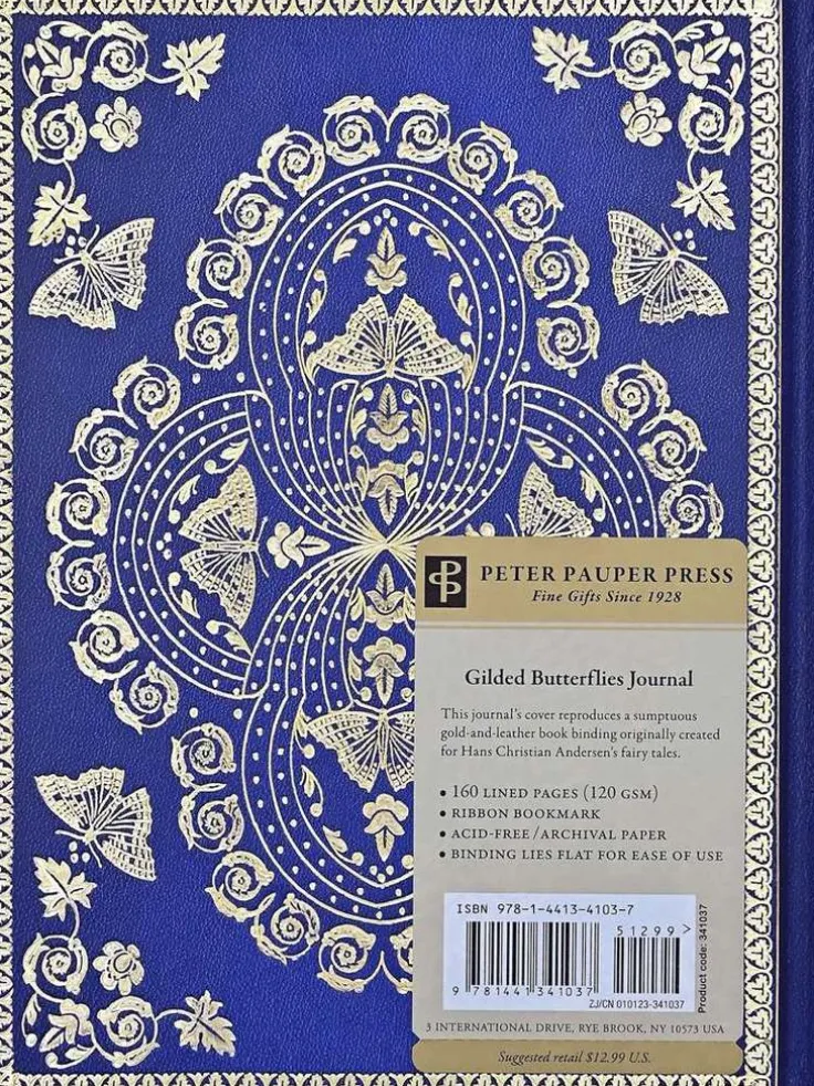 Inbunden anteckningsbok i A5 format med präglat hårdomslag och dekorerad med vackra folierade detaljer. Matchande design på ryggen av boken. Sidkanterna är folierade i guld. Boken innehåller 160 linjerade elfenbensvita sidor med svagt grå linjer. Kraftigt papper i 120g. En sidmarkör i matchande satin i gör att du lätt hittar bland dina anteckningar.Omslaget Gilded Butterflies återskapar en juvelprydd bokbindning från omkring 1920, designad för en sagosamling av Hans Christian Andersen. Originalet, skapat av ateljén Bayntun-Riviere, var tillverkat av guld och läder.
