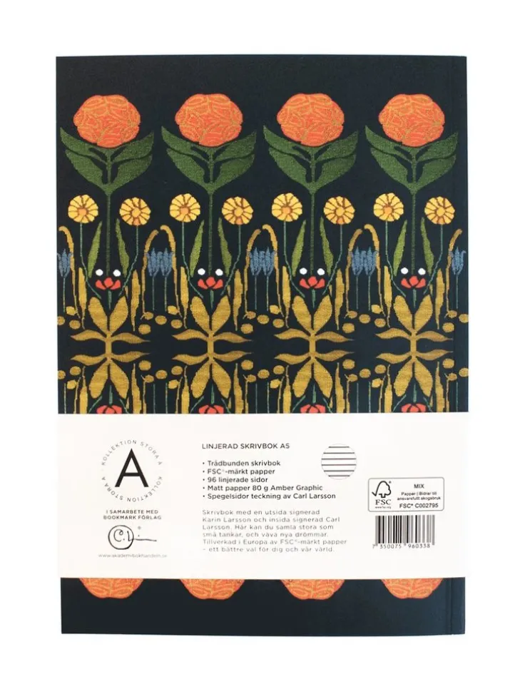Vacker skrivbok i mjukpärm med 96 linjerade sidor att samla dina tankar och idéer i. Utsidan är designad av Karin Larsson och insidan skapad av Carl Larsson. Omslaget föreställer olika djur som rävar, grodor, kaniner och ormar. Mönstret designades av Karin Larsson för cirka 100 år sedan och var ursprungligen vävt och komponerat med lingarn, ullgarn och halvylleband.A5-format.80 g linjerat papper.Tillverkad i Europa av FSC®-märkt papper, ett bättre val för dig och vår värld.Carl och Karin Larsson är ett av Sveriges mest inflytelserika konstnärspar genom tiderna. Deras konstnärskap verkade i stark symbios, bland annat genom att Karin designade de spektakulära miljöer som Carl sedan målade av. Motiven från deras hem i Sundborn har kommit att representera bilden av Sverige och älskas världen över. Genom att köpa produkter från Carl Larsson-gårdens officiella partners är du med och bidrar till bevarandet av Carl Larsson-gården i Sundborn och kulturarvet efter Carl och Karin Larsson. Nu i ett unikt samarbete med Akademibokhandeln för vår egen kollektion – Kollektion Stora A.