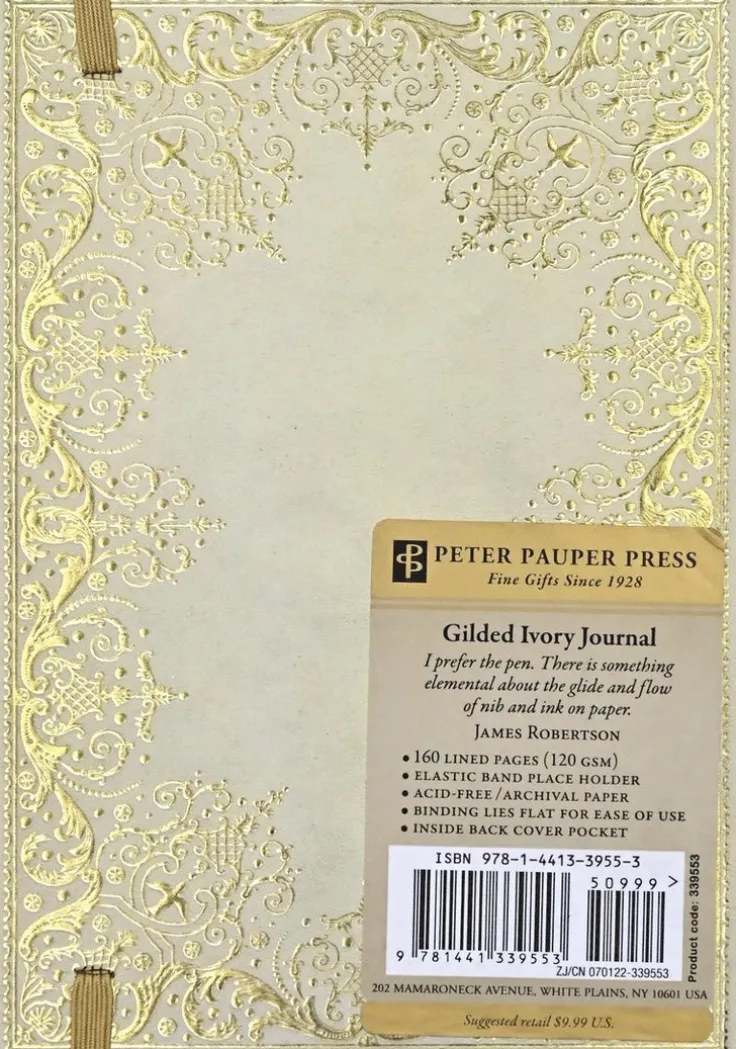 Inbunden anteckningsbok i A6 med präglat hårdomslag och dekorerad med fina folierade detaljer på omslaget. Sidkanterna är folierade i guld. Boken innehåller 160 linjerade elfenbensvita sidor med svagt grå linjer. Längst bak i boken finns en rymlig förvaringsficka för dina lösa papper. Boken hålls stängd med ett elastiskt band i matchande färg.