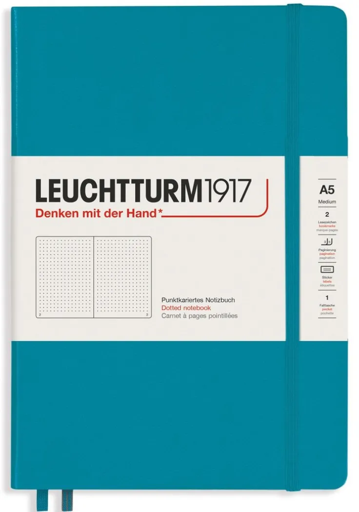 Notebook från Leuchtturm1917 – en anteckningsbok i praktiskt A5-format med 251 prickade (dotted) och numrerade sidor varav 8 sidor är perforerade och löstagbara. FSC-certifierat och ink-proof (80g) papper. Märkband och förvaringsficka. Resårband runt boken. Självhäftande etiketter för märkning och arkivering. Färg: Ocean