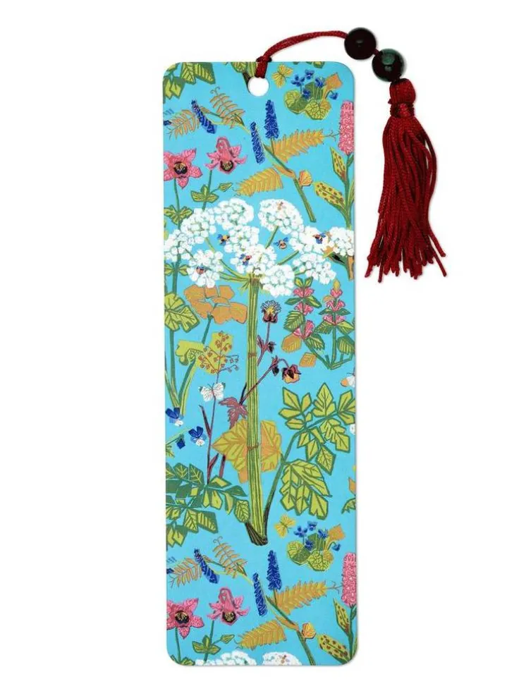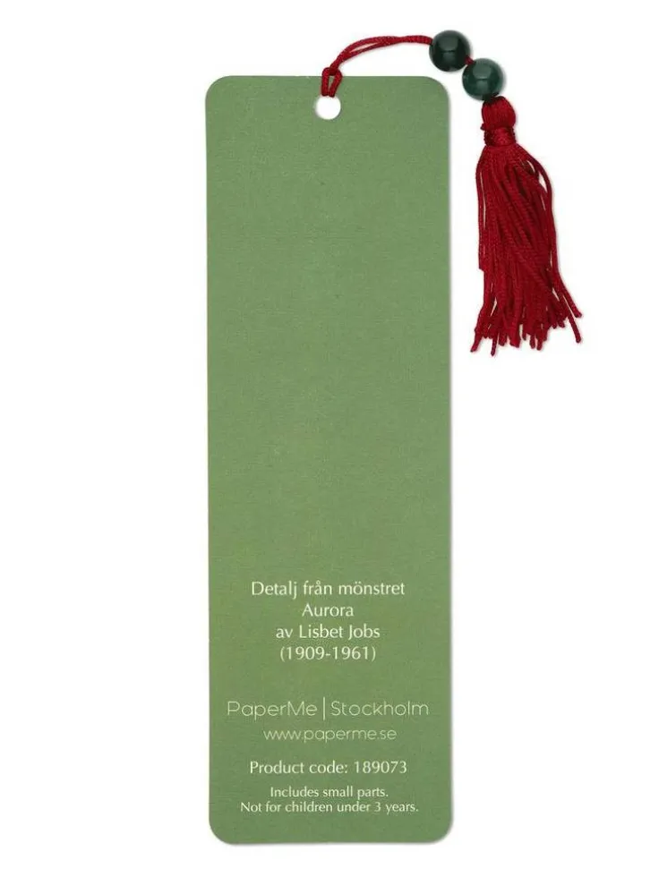 Bokmärke med tofs och två pärlor. Detalj från mönstret Aurora av konstnärinnan Lisbet Jobs (1909-1961). Rundade hörn. FSC märkt papper. Kommer i en plastficka.