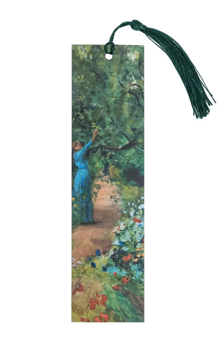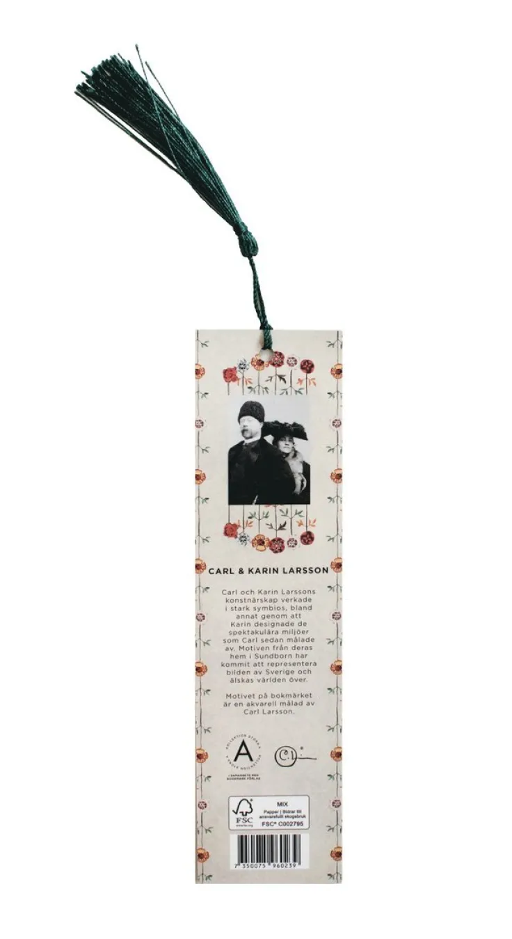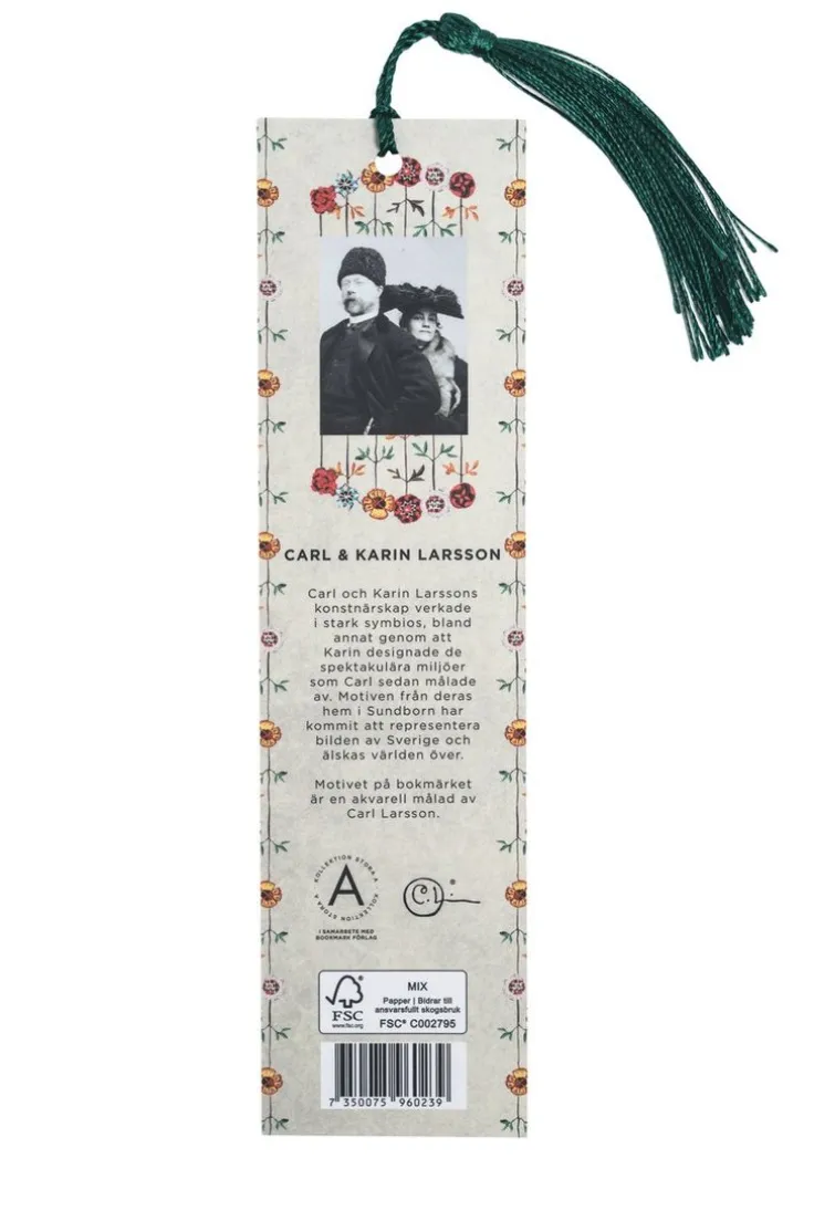 Ett ljuvligt bokmärke med tofs som gör din resa i böckernas värld ännu vackrare. Framsidan är skapad av Carl Larsson och baksidan är designad av Karin Larsson. Framsidan föreställer en blommande trädgård i Marstrand där paret ofta vistades i perioder. Akvarellen målades av Carl Larsson 1889 och heter ”Trädgårdsscen från Marstrand”.Mått: 5×19 cm.240 g papper.Tillverkad i Europa av FSC®-märkt papper, ett bättre val för dig och vår värld.Carl och Karin Larsson är ett av Sveriges mest inflytelserika konstnärspar genom tiderna. Deras konstnärskap verkade i stark symbios, bland annat genom att Karin designade de spektakulära miljöer som Carl sedan målade av. Motiven från deras hem i Sundborn har kommit att representera bilden av Sverige och älskas världen över. Genom att köpa produkter från Carl Larsson-gårdens officiella partners är du med och bidrar till bevarandet av Carl Larsson-gården i Sundborn och kulturarvet efter Carl och Karin Larsson. Nu i ett unikt samarbete med Akademibokhandeln för vår egen kollektion – Kollektion Stora A.