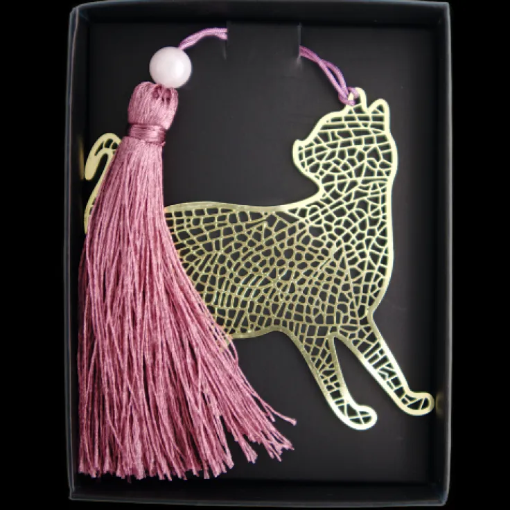 Bokmärke av metall. Det här i form av en katt. Tunna metalltrådar formar designen. Med en fin tofs och dekorativ pärla i rosalila färg. Förpackad i trevlig ask.