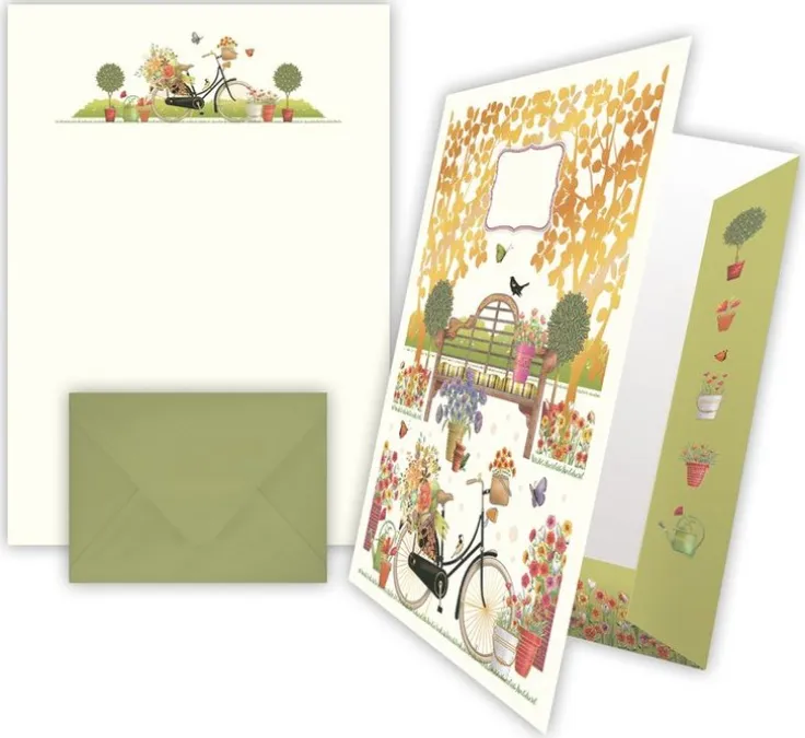 Ett klassiskt brevpapper med kuvert i en fin folder att spara. Brevpappersarken är i A4 storlek, fint dekorerade i överkant. Pappret är i svag linnestruktur som ger en fin känsla. Foldern innehåller 10 pappersark och 10 gröna kuvert. Foldern är i kraftigare kartong och passar utmärkt att förvara sina brev eller urklipp i.