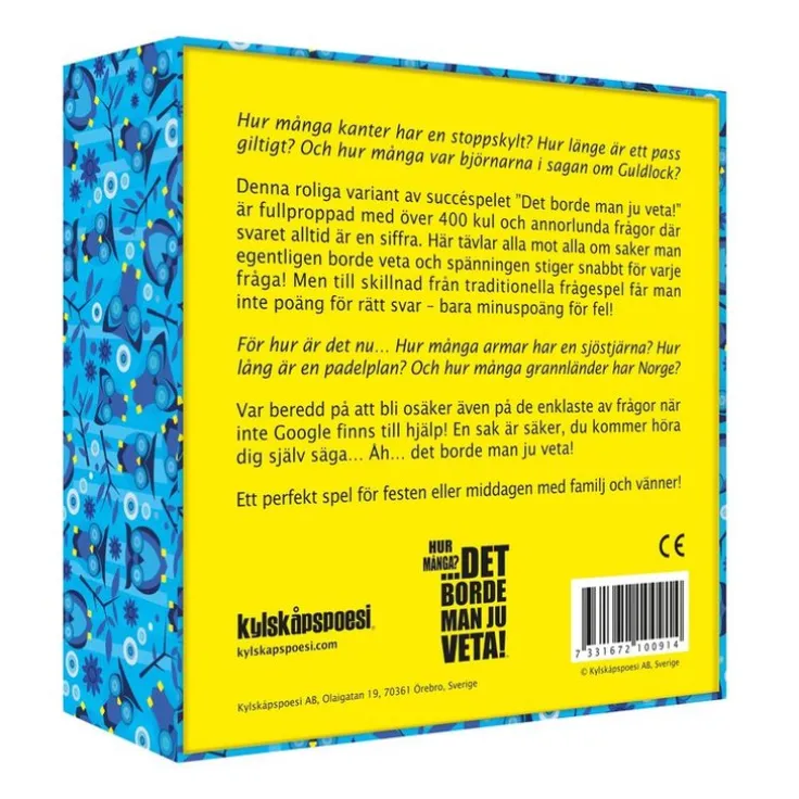 Hur många kanter har en stoppskylt? Hur många grannländer har Norge? Och hur många barn har farbror Melker i Vi på Saltkråkan? Denna roliga variant av succéspelet ”Det borde man ju veta!” är fullproppad med över 400 kul och annorlunda frågor där svaret alltid är en siffra. Här tävlar alla mot alla om saker man egentligen borde veta och spänningen stiger snabbt för varje fråga! Men till skillnad från traditionella frågespel får man inte poäng för rätt svar – bara minuspoäng för fel! För hur är det nu… Hur många armar har en sjöstjärna? Hur lång är en vanlig padelplan? Och hur länge är ett körkort giltigt? Var beredd på att bli osäker även på de enklaste av frågor när inte Google finns till hjälp! En sak är säker, du kommer höra dig själv säga… Åh… det borde man ju veta! Ett perfekt spel för festen, middagen eller med familj och vänner!