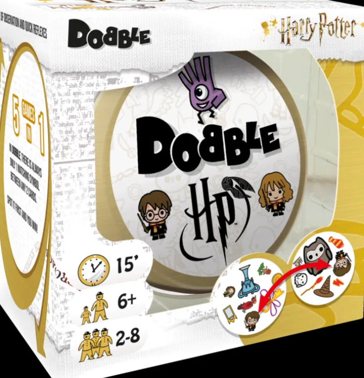 Dobble Harry Potter utmanar spelarna att hitta de matchande symbolerna bland bilder på Harry Potter, Hermione Granger, Ron Weasley, trollspön, magiska varelse och mycket mer från våras alla favorit magi universum. Dobble är spelet där snabbhet, observation och reflexerna sätts på prov. Det är 8 symboler på varje kort och alltid bara en symbol som delas av två kort. Hitta den före dina motståndare!