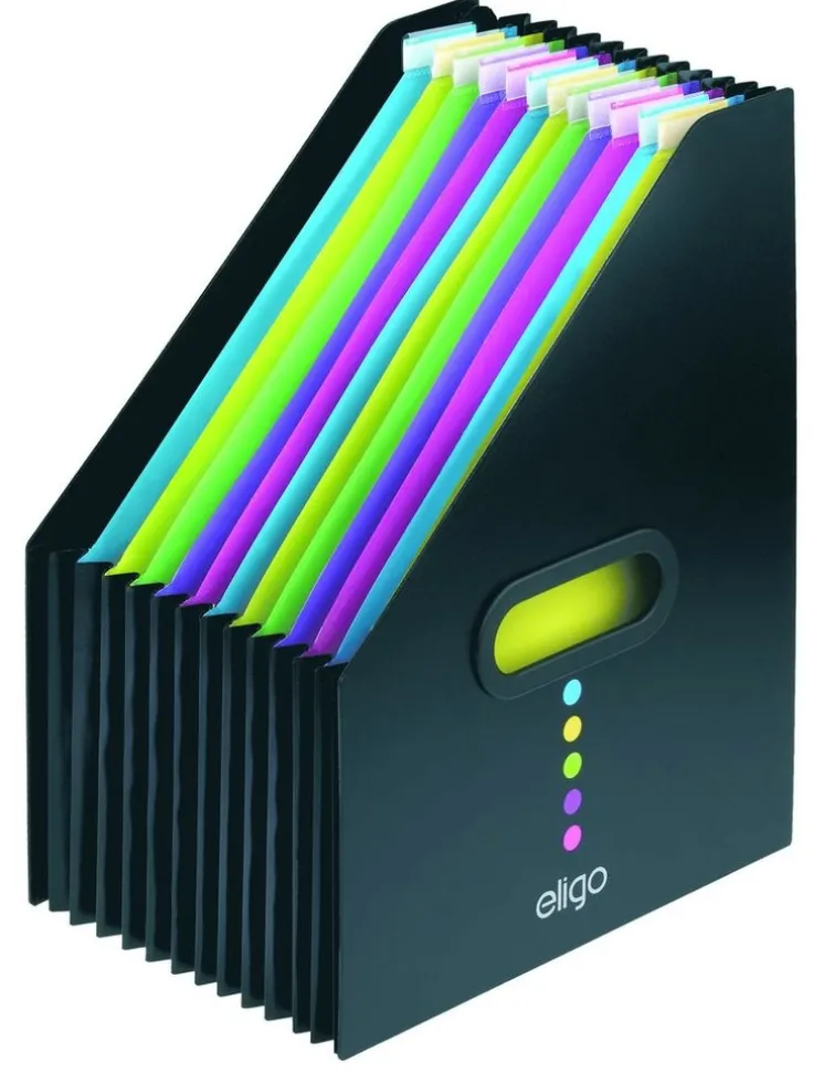 Elegant dokument/sorteringsbox i stående A4+ format. Gjord i mycket kraftig följsam svart plast. 13 fack i olika färger, expanderbar med index-etiketter att skriva på. Rymmer totalt ca 1000 papper. Idealisk på skrivbordet och i hyllan. Platsbesparade och flexibel. Har två kraftiga handtag som gör det enkelt att flytta eller att ställa undan boxen. Ger dig en enkel översikt av vad du har i din box. En smakfull och praktisk produkt på ditt skrivbord!