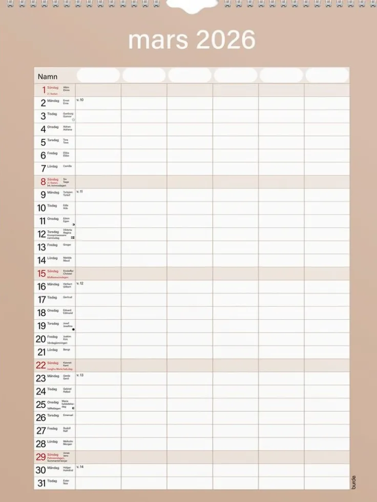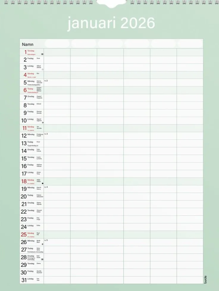 En neutral praktisk familjekalender att hänga på väggen. Kalendern har sex kolumner som passar den stora familjen eller för er som vill ha en möjlighet att planera det där lilla extra för att få ihop ert livspussel. Använd exempelvis de extra kolumnerna till att planera in måltider eller födelsedagar. Familjekalender 25/26 från Burde. Format: 295×390 mm. Layout: Månad/blad. Kalendarium: 2025-07-01 – 2026-06-30. Spiralbunden. Innehåll: 6 kolumner. Antal sidor: 12. Miljöinformation: FSC®.