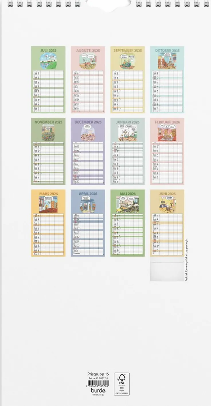 En vägghängd kalender med ny humoristisk bild varje månad. Underlätta vardagen med ett skratt! Kalendern innehåller 5 kolumner där alla familjemedlemmar får varsin kolumn att planera in aktiviteter och kom-ihåg. Kalendern har även en praktisk förvaringsficka i papper med plats för kvitton eller annat viktigt.Familjekalender 25/26 från Burde. Format: 220×430 mm. Layout: Stående. Månad/uppslag. Kalendarium: 2025-07-01 – 2026-06-30. Omslag: Kartong. Spiralbunden. Detaljer: Pappersficka. Innehåll: 5 kolumner. Antal sidor: 12. Miljöinformation: FSC®.