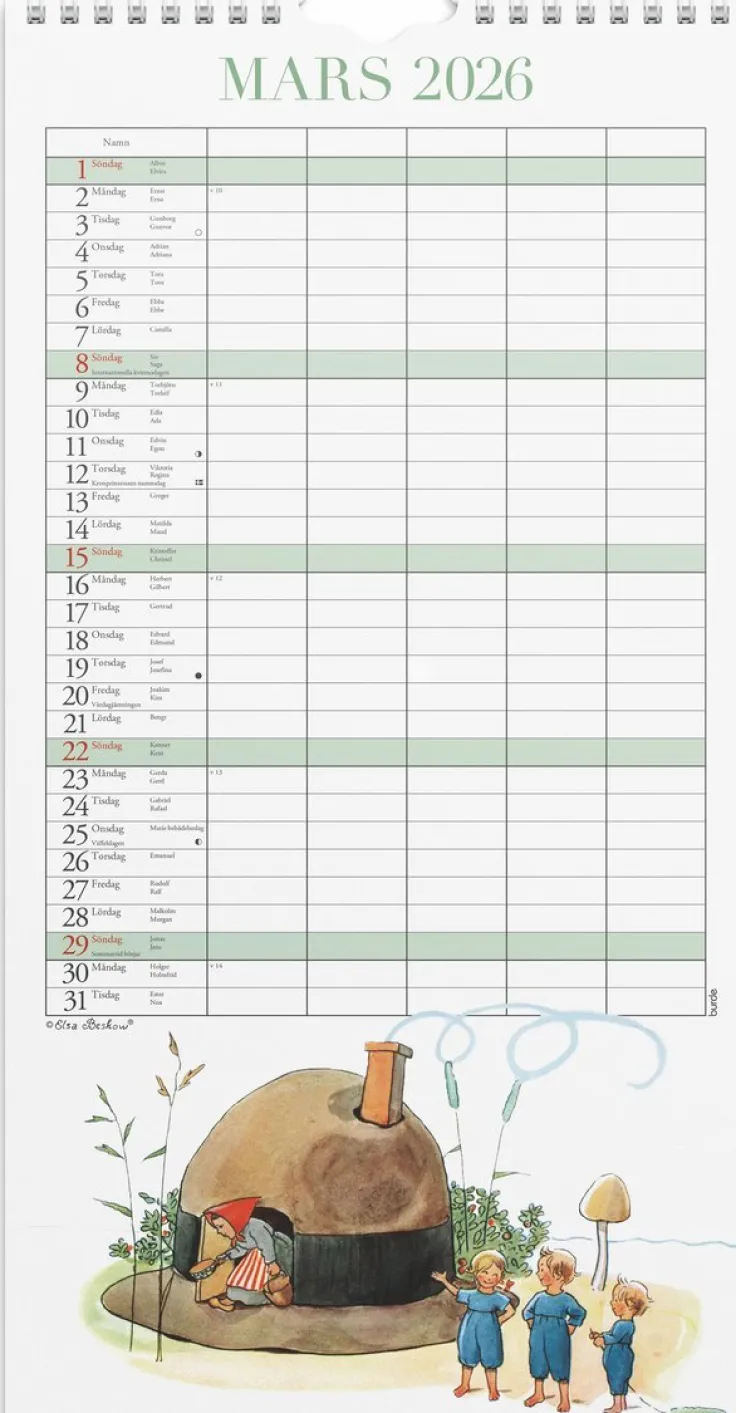 Kom ihåg föräldramöte, tandläkartider, träningstider och all annan nödvändig planering för att få familjepusslet att gå ihop. Elsa Beskows underbara illustrationer i en familjekalender med fem kolumner är den givna hjälpen!>Familjekalender 2026 från Burde. Format: 220×430 mm. Layout: Månad/blad. Kalendarium: 2026-01-01 – 2026-12-31. Spiralbunden. Detaljer: Pappersficka. Innehåll: Flaggdagar, helgdagar/aftnar, månfaser, namnsdagar, temadagar/händelser, 5 kolumner. Antal sidor: 12. Miljöinformation: FSC®.