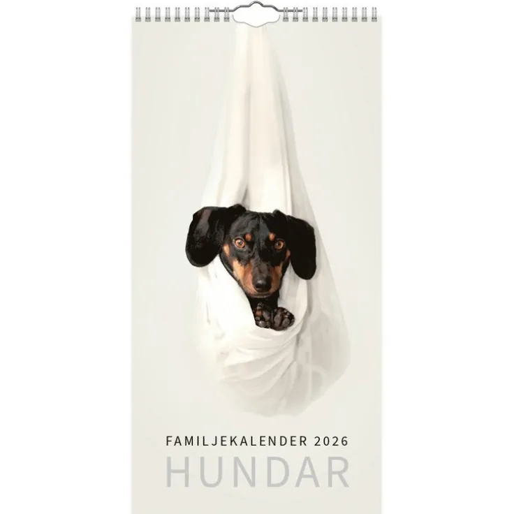 Familjekalender Hundar 2026 med foton på söta hundar. Kalendern har fem kolumner för familjens aktiviteter. Svenska namndagar och helgdagar. Kalendern är producerad och tryckt i Sverige på svenskt papper. Märkt med både Svanen och FSC.