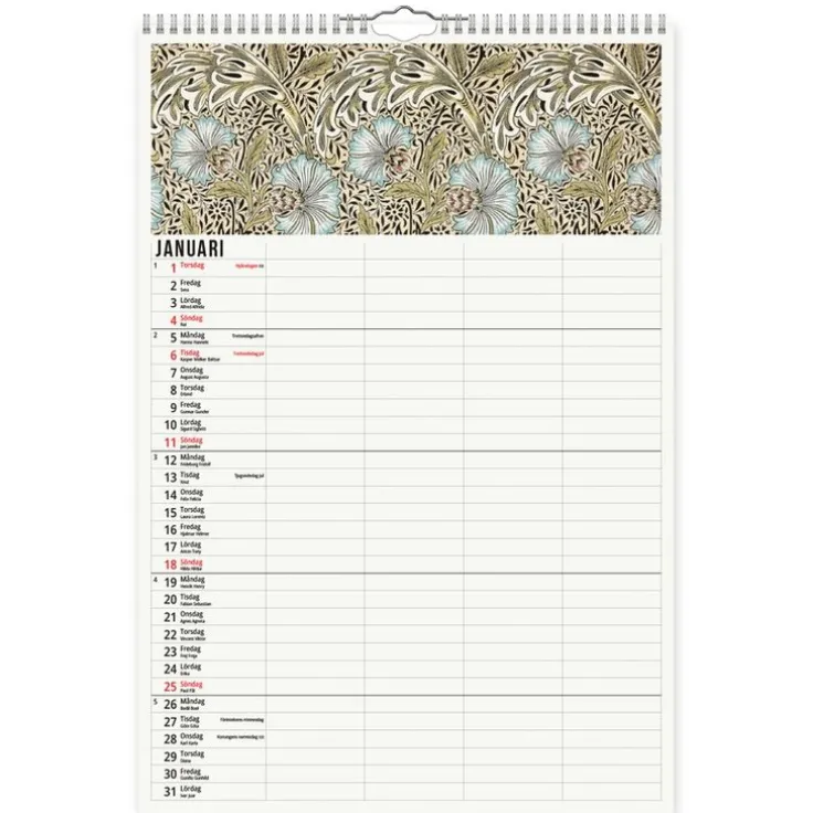 Familjekalender med William Morris vackra mönster. Kalendern har 6 kolumner för hela familjens aktiviteter. Svenska namndagar och helgdagar. Kalendern är producerad och tryckt i Sverige på svenskt papper. Märkt med både Svanen och FSC.