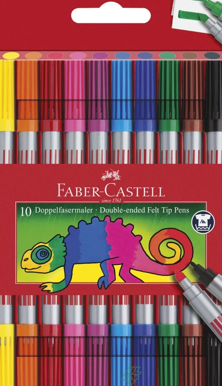 Fiberpenna med en fin och en bred spets som tål ett tryck på upp till 3 kg, CE certifierad = giftfritt innehåll & färgämne, etui med 10 färger.