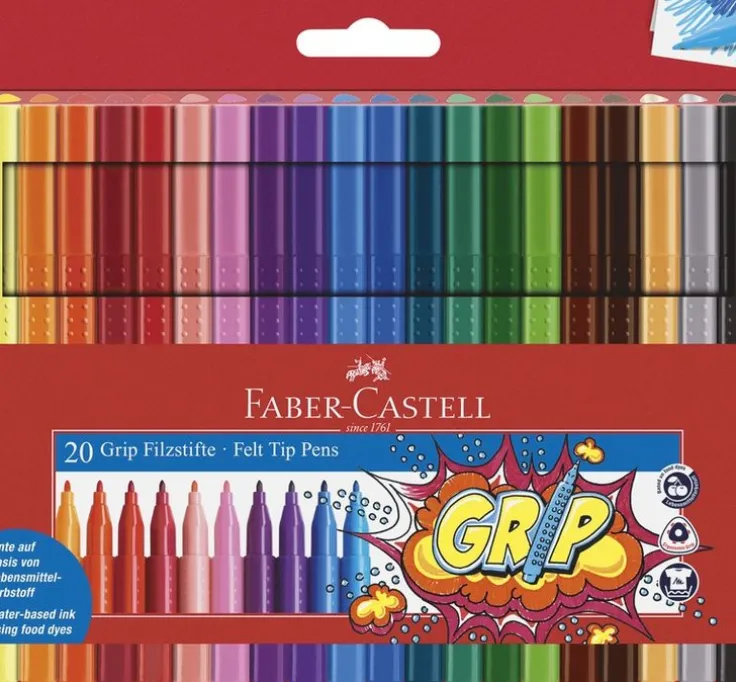 Fantastiska fiberspetspennor från den berömda Grip serien där ingenting är lämnat åt slumpen. Etui med 20 pennor i strålande färger. Ergonomiskt triangelformade pennor med patenterad Grip-zone för ett säkert och halkfritt grepp. Överlägset tålig fiberspets som klarar ett tryck på minst 3kg. Kan enkelt tvättas bort från de flesta textiler. Perfekta för både höger- och vänsterhänta. Ventilerad säkerhetshuv.