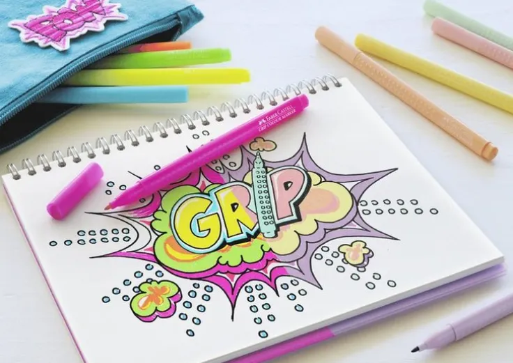 Fiberpenna Grip, etui med 5 st neon- och 5 st pastellfärger, tvättbar från de flesta textiler, spets som tål 3 kg tryck.