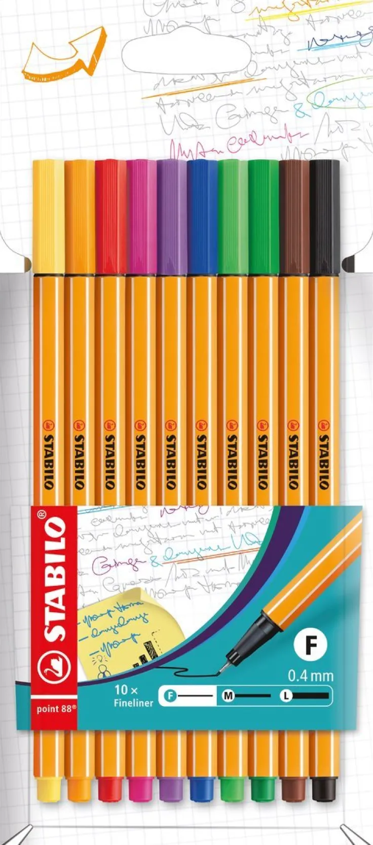 STABILO Point 88 fineliner. Skrivspetsen är metallomsluten för en längre livslängd för pennan. Med STABILO point 88 skrivs tunna fina linjer utan risk för att färgen smetas ut. Pennan är sexkantigt utformad med en lång ”cap off” tid och ventilerad huv och har en pennspets på 0,4 mm. I detta paket får du pennor i 10 olika färger.