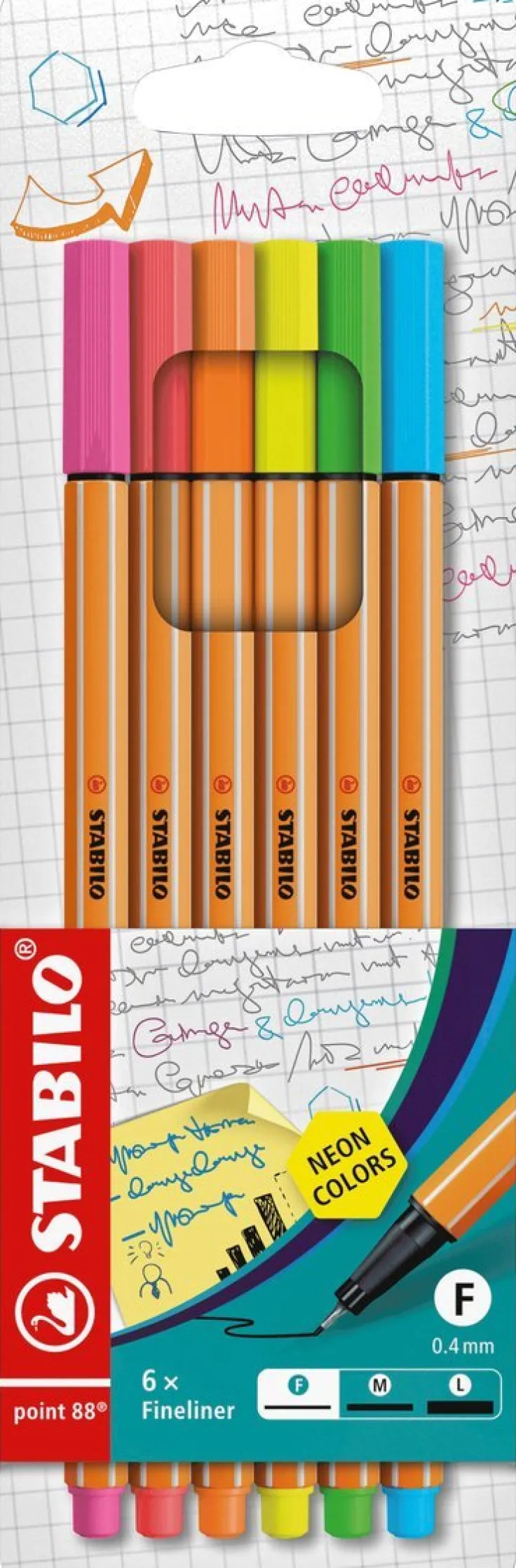 STABILO Point 88 fineliner. Skrivspetsen är metallomsluten för en längre livslängd för pennan. Med STABILO point 88 skrivs tunna fina linjer utan risk för att färgen smetas ut. Pennan är sexkantigt utformad med en lång ”cap off” tid och ventilerad huv och har en pennspets på 0,4 mm. I detta paket får du pennor i 6 neonfärgade pennor.