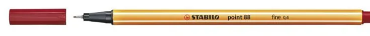 STABILO point 88 fineliner. Det är den enda finelinern som finns i så många som 47 olika färger. Skrivspetsen är metallomsluten för en längre livslängd för pennan. Med STABILO point 88 skrivs tunna fina linjer utan risk för att färgen smetas ut. Pennan är sexkantigt utformad med en lång ”cap off” tid och ventilerad huv och har en pennspets på 0,4 mm.