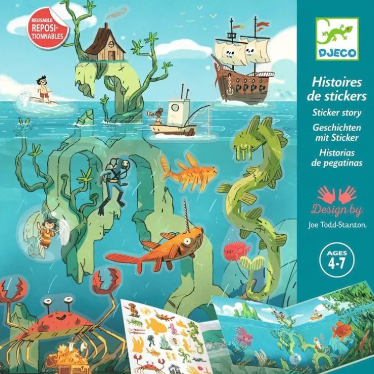 Ett inspirerande set med två stora bakgrundsbilder av havets djup samt ett brett urval klistermärken som kan flyttas om och om igen för att skapa nya bilder och väcka otaliga spännande berättelser till liv. Setet består av en lättanvänd och stadig mapp där du kan bläddra mellan de två 22 x 44 cm stora bilderna som föreställer en solig och en molnig havskust som är redo att befolkas av de fantasifulla figurerna på klistermärkena. Dessutom har mappen två utvikbara sidor med siluetter som motsvarar var och en av de cirka 50 återanvändbara klistermärkena så att de kan förvaras strukturerat när de inte används och alltid finnas till hands samt vara enkla att hitta. Det här är en rolig och kladdfri aktivitet som dessutom är lätt att ta med sig överallt i den miljövänliga mappen av FSC®? certifierad kartong. Innehåll: 1 stadig mapp med två stora bakgrunder (22 x 44 cm utvikta) och runt 50 återanvändbara klistermärken i vinyl.