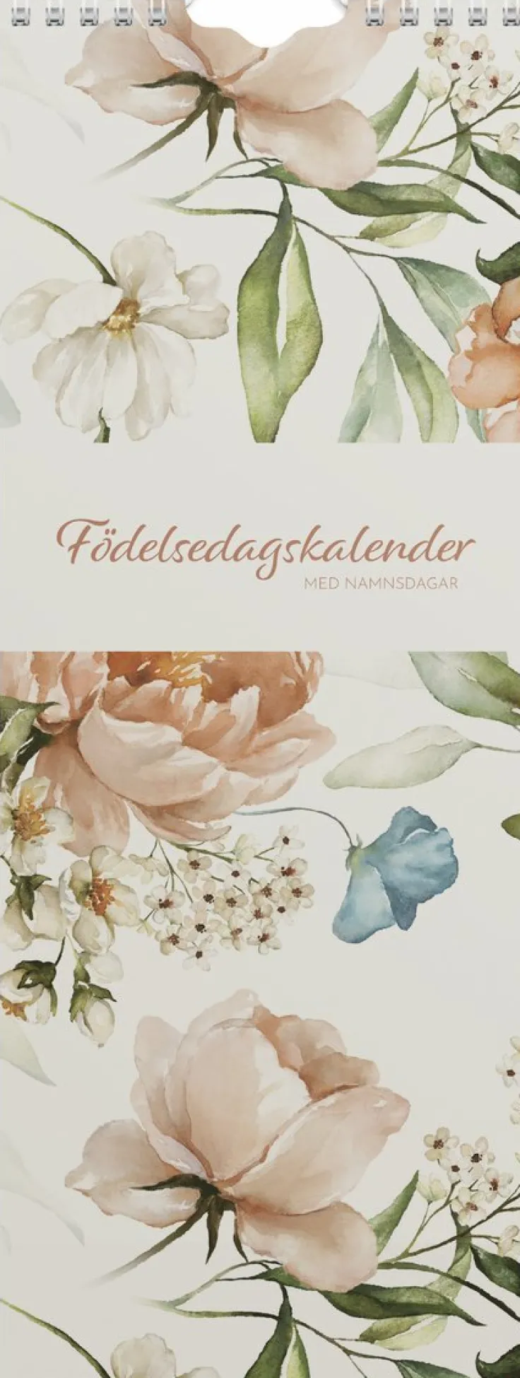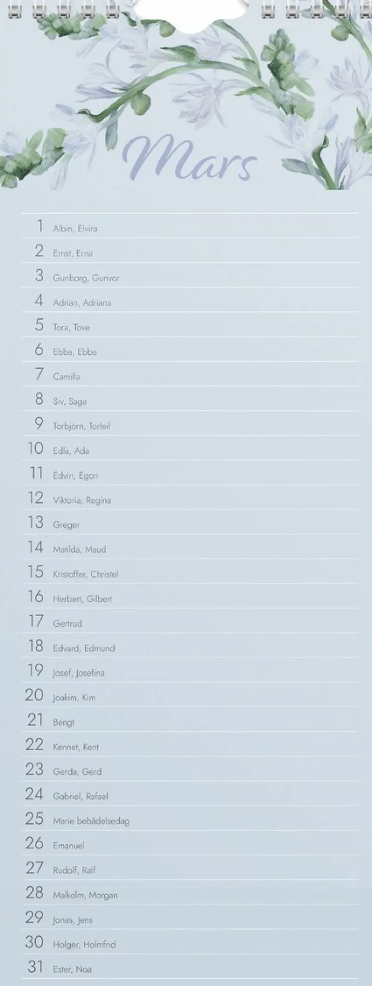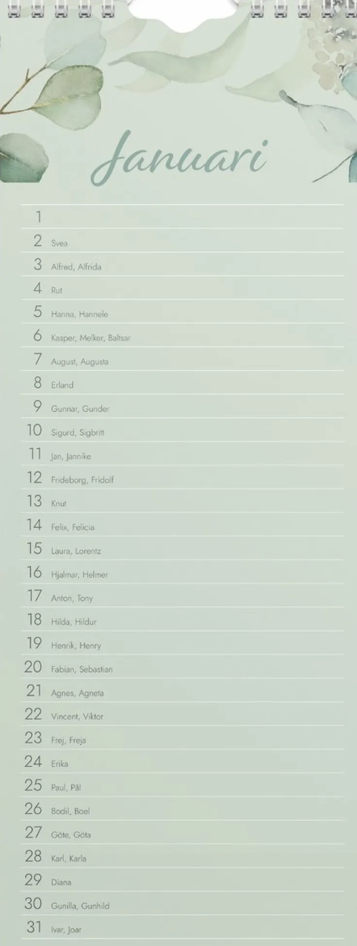 En odaterad kalender som kan hänga på väggen år efter år som ett komplement till den dagliga planeringen. Kalendern är ett perfekt ställe att fylla i vem som fyller år eller andra minnesvärda dagar som firas med nära och kära. Med en kolumn och odaterade månadsblad så är det enkelt att skriva upp speciella återkommande dagar. Väggkalendern innehåller också svenska namnsdagar.Format: 120×315 mm. Layout: Månad/blad. Spiralbunden. Innehåll: Namnsdagar. Antal sidor: 12. Pappersvikt: 170 g. Miljöinformation: FSC®. Varumärke: Burde.