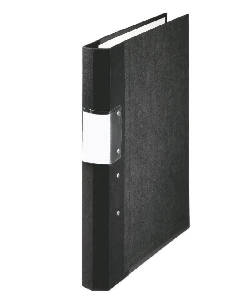 Svart A4-pärm med svart, tygklädd rygg. 40 mm ryggbredd. Träryggspärm av hög kvalitet med kantförstärkning och FSC-certifierat, miljömässigt hållbart omslag.