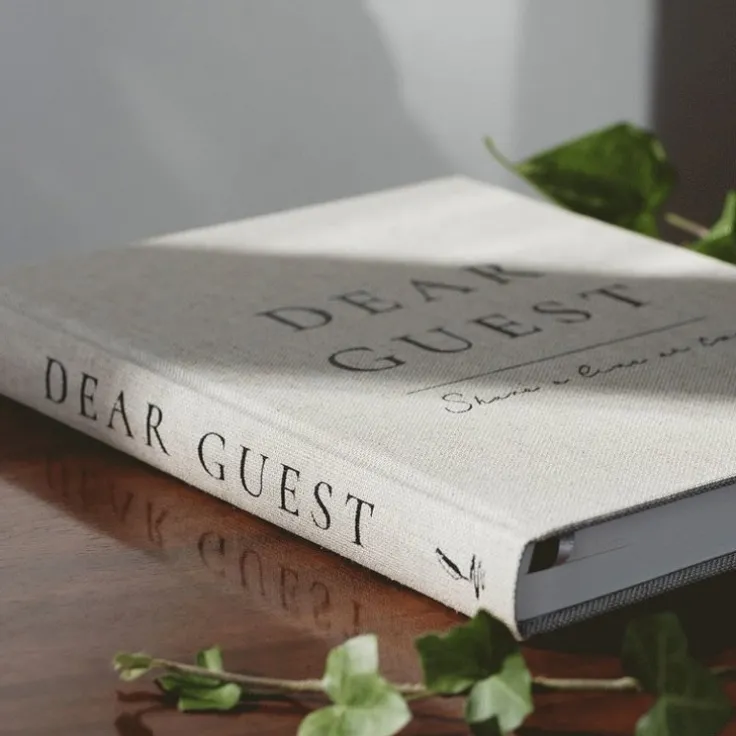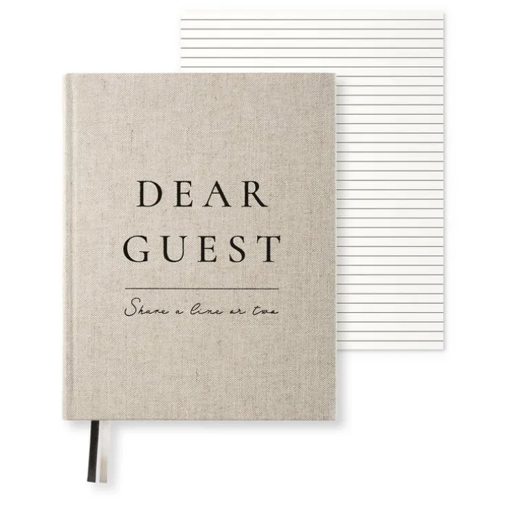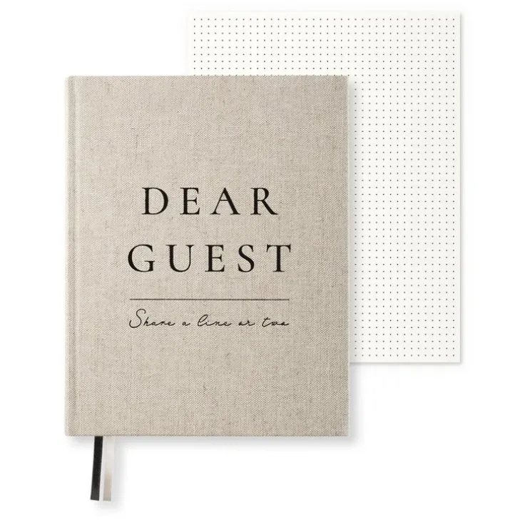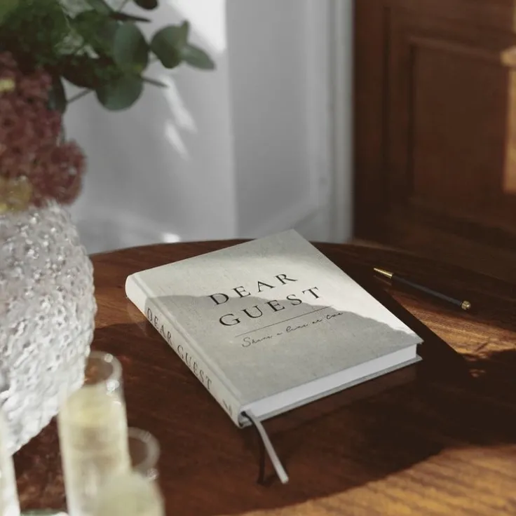 Gästbok från Paperstyle med svensk design är en gästbok som passar perfekt i ditt hem, i stugan, på ett hotell eller en restaurang. Svart tryck på bokens framsida med texten Dear Guest / Share a Line or Two. Låt dina gäster dela ett par rader efter sitt middagsbesök eller efter festen. Varje hälsning blir ett värdefullt minne att spara. Det följer med ett löst blad som har linjer på den ena sidan och prickar på den andra vilket gör att du kan använda boken med olinjerad, linjerad eller prickad inlaga. Gästboken har ett exklusivt svenskt 115 grams papper från Munken som är FSC-och Cradle to Cradle certifierat, syrafritt, åldersbeständigt och kommer från ett av världens renaste pappersbruk. Den har ett hållbart och vackert textilomslag från Europa och pärmens insida består till 100% av återvunnen papp. Den är producerad CO2-neutralt på ett noga utvalt bokbinderi i Europa. Gästboken är framtagen med stor omtanke om vår miljö. Färg: Rough Linen