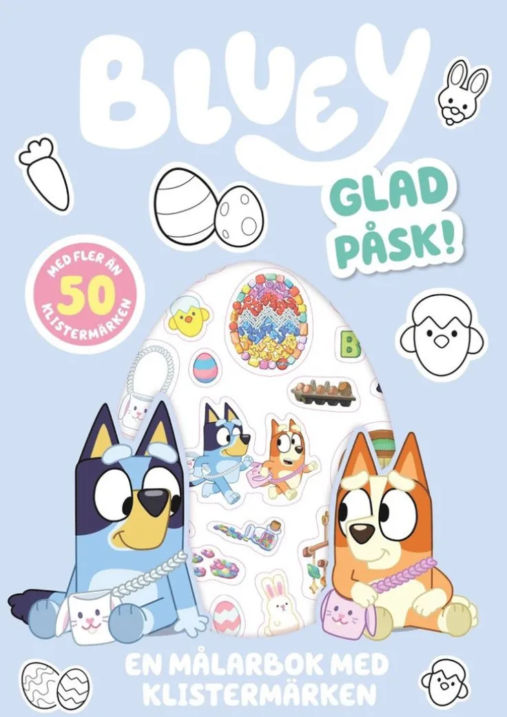 Fira påsk med Bluey och Bingo när de letar efter påskägg i den här målarboken. Färglägg deras jakt på ledtrådar och dekorera med klistermärken.