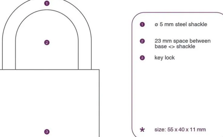 Lås dina värdesaker säkert med ett hänglås som har ett stålfodral som stängs med en härdad stålbygel och nyckel.3 nycklar medföljerBas: 40 x 27 x 11 mmDiameter bas bygel: 23 mmHöjd produkt: 55 mm