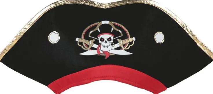 Svart sjörövarhatt med röda och guldfärgade kanter och detaljer. Framtill har sjörövarhatten ett stort dödskalletryck. Sjörövarhatten är tillverkad i mjukt filtmaterial och är en perfekt följeslagare på barnkalas och maskerader.