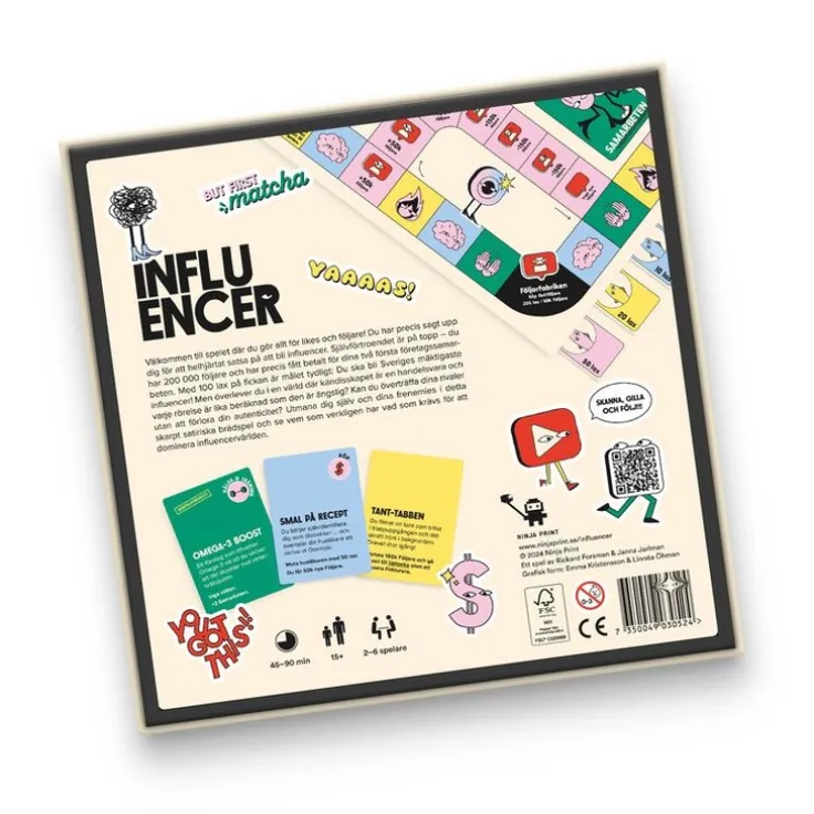 Jakten på en miljon följare!Välkommen till spelet där du gör allt för likes och följare!Du har precis sagt upp dig för att helhjärtat satsa på att bli influencer. Självförtroendet är på topp – du har 200 000 följare och har precis fått betalt för dina två första företagssamarbeten. Med 100 lax på fickan är målet tydligt: Du ska bli Sveriges mäktigaste influencer! Men överlever du i en värld där kändisskapet är en handelsvara och där varje rörelse lika beräknad som den är ängslig? Kan du överträffa dina frenemies utan att förlora din autenticitet? Utmana dig själv och dina vänner i detta skarpt satiriska brädspel och se vem som verkligen har vad som krävs för att dominera influencervärlden.Innehåll:1 spelplan 7 spelpjäser 6 faktureringsbrickor 14 markörer60 händelsekort 60 taktikkort 60 samarbetskort 120 sedlar i blandade valörer 1 tärning 1 regelbok3-6 spelare Speltid 45-90 minuter Rek. ålder från 15 år
