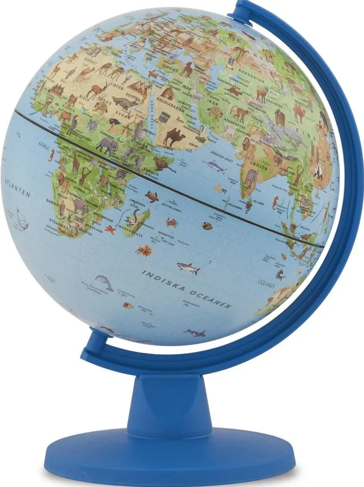 Jordglob 16 cm diam med svensk text. Barngloben är en klassisk blå jordglob med geografisk kartbild som har fina illustrationer av djur och kända landmärken som väcker nyfikenhet. Globen är lite mindre och utan belysning vilket gör den enkel att placera.