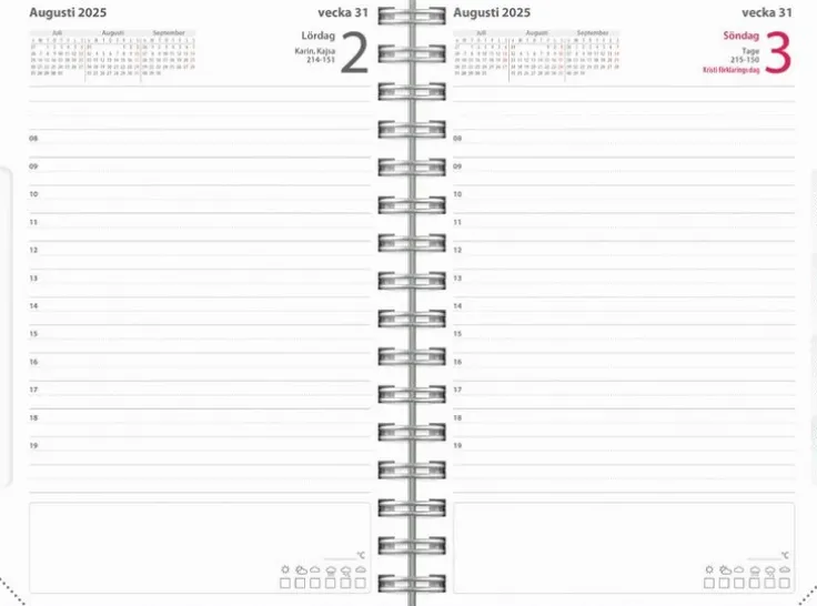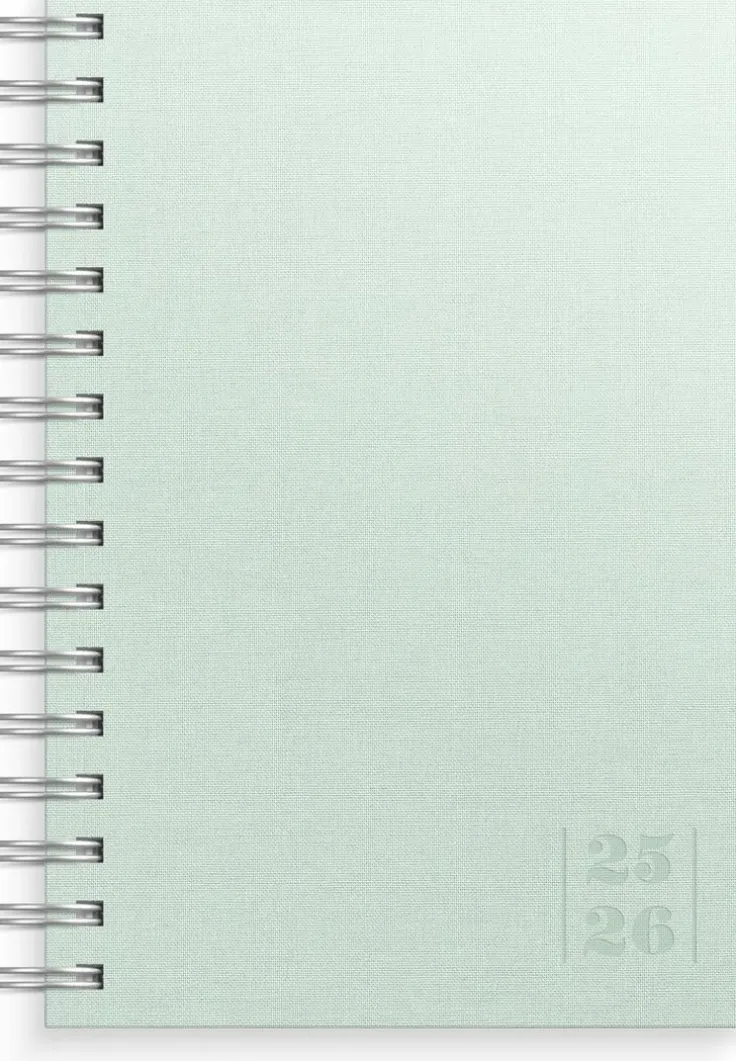 Dagbok har ett kalendarium med en dag per sida och en timindelning 8-19 med mycket skriv-yta för alla aktiviteter och to do:s. Innehåller även årsplaner och ett urstansat månadsregister för att lättare hitta till rätt månad.Omslag i grön linnetextil med präglat årtal ger ett mjukt och elegant intryck.Kalender 25/26 från Burde. Format: 135×205 mm. Layout: Dag/sida. Timindelning 8-19. Kalendarium: 2025-07-01 – 2026-06-30. Omslag: Linnetextil. Spiralbunden. Innehåll: Provresultat, Årsplan. Antal sidor: 400. Miljöinformation: FSC®.
