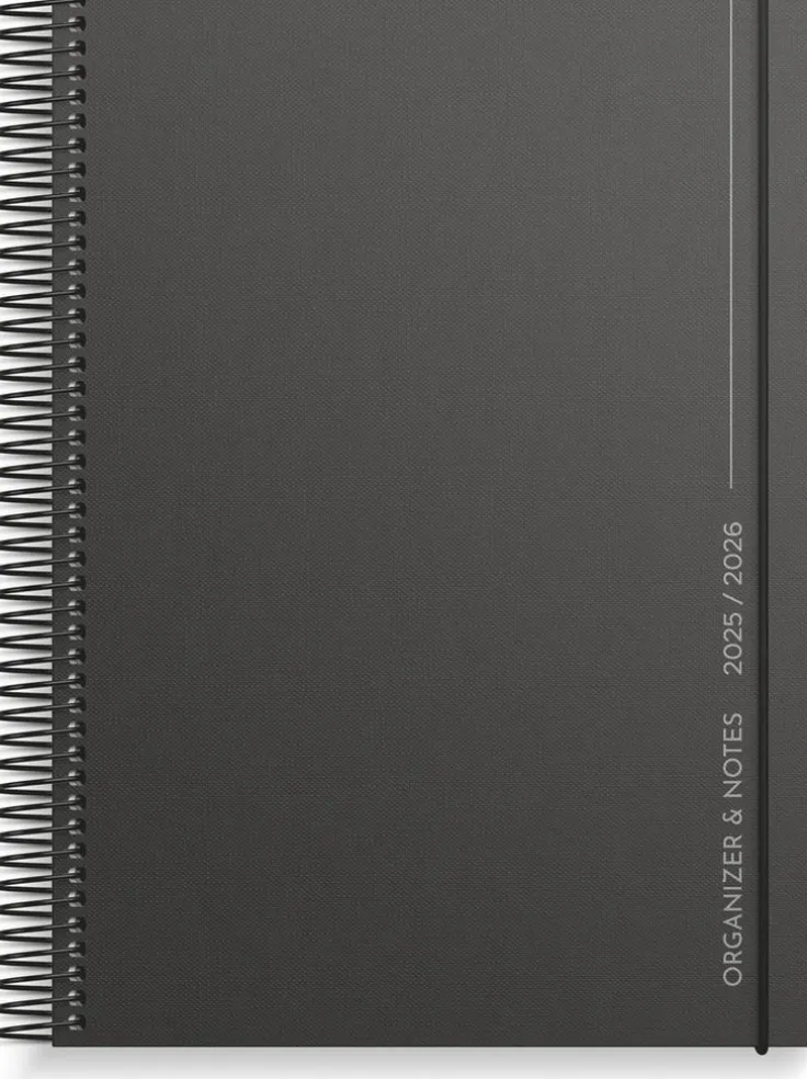 En kalender och anteckningsbok i ett! Första halvan innehåller ett kalendarium med vertikal veckolayout, medan andra halvan är linjerade sidor för dina listor och anteckningar. Med hjälp av de flyttbara flikarna förflyttar du dig smidigt mellan veckoplanering och anteckningar. Perfekt som komplement till digital planering. Klädd i en svart strukturerad kartong blir Organizer & Notes en stilfull följeslagare på möten och i vardagslivet.Format: A5. Layout: Liggande. Vecka/uppslag. Kalendarium: 2025-06-02 – 2026-07-12. Omslag: Kartong med struktur. Spiralbunden. Detaljer: Gummiband. Flyttbara plastmarkörer. Innehåll: Anteckningssidor, Årsöversikter, Årsplaner. Antal sidor: 256. Miljöinformation: FSC®.