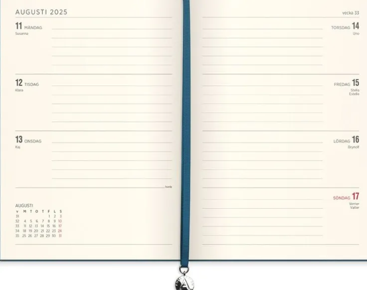 Format: A5. Layout: Liggande. Vecka/uppslag. Kalendarium: 2025-06-02 – 2026-07-05. Omslag: Konstläder. Inbunden. Detaljer: Märkband. Antal sidor: 144. Miljöinformation: FSC®.
