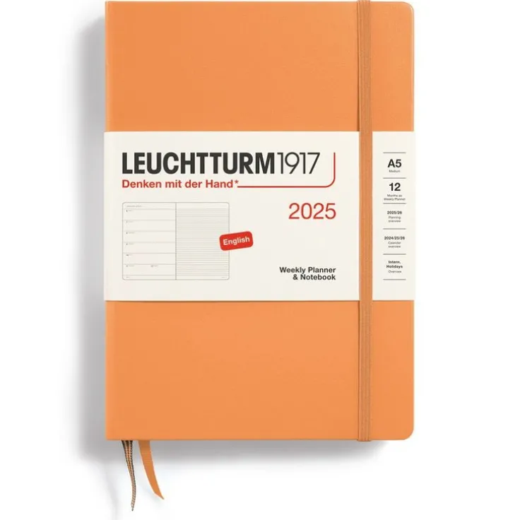 Kalender 2025 Leuchtturm1917 i A5-format med inbunden hård pärm, Weekly Planner & Notebook med veckans dagar på vänster sida och linjerat anteckningsblad på den högra sidan av ett uppslag – kalender och anteckningsbok i ett. Kalendern innehåller även separat häfte med födelsedagar, dagar att komma ihåg och adressbok. Kraftig förvaringsficka längst bak. Dubbla märkband. Informationssidor med bl a internationella helgdagar i 58 länder, vilket gör det lätt att hitta helgdagar i sitt eget land, praktiskt även vid planering av resor. Projektplaneringsblad. Perforerade avrivningsbara sidor för anteckning. Praktisk resårsnodd som håller ihop kalendern. FSC-certifierat papper. Färg: Apricot