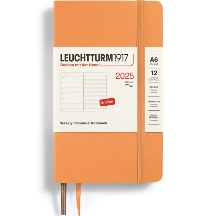 Kalender 2025 Leuchtturm1917 i A6-format med mjuk pärm, Weekly Planner & Notebook med veckans dagar på vänster sida och linjerat anteckningsblad på den högra sidan av ett uppslag – kalender och anteckningsbok i ett. Kraftig förvaringsficka längst bak. Dubbla märkband. Informationssidor med bl a internationella helgdagar i 58 länder, vilket gör det lätt att hitta helgdagar i sitt eget land, praktiskt även vid planering av resor. Projektplaneringsblad. Perforerade avrivningsbara sidor för anteckning. Praktisk resårsnodd som håller ihop kalendern. FSC-certifierat papper. Färg: Apricot