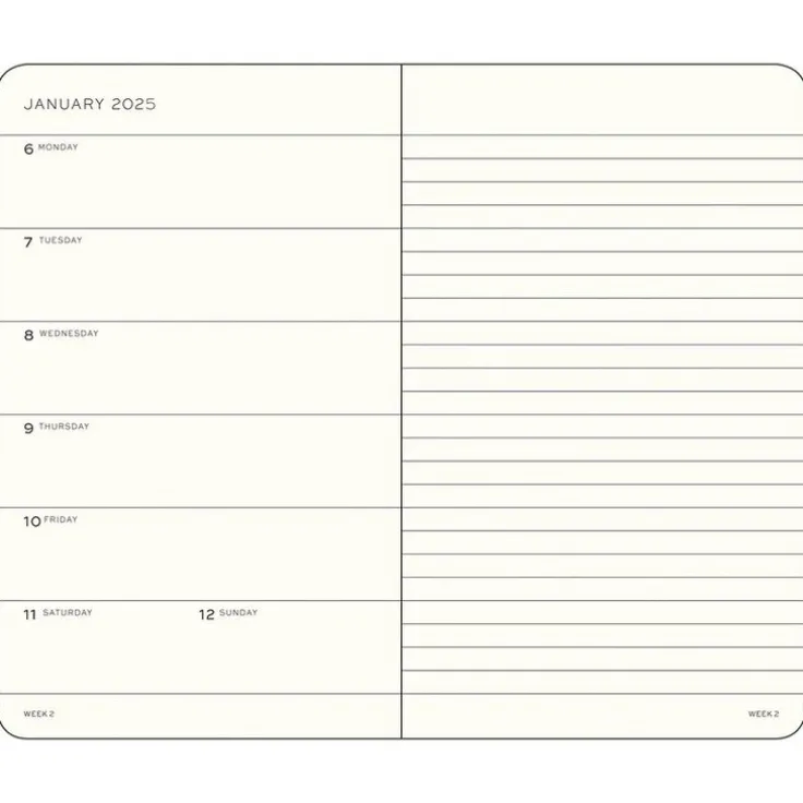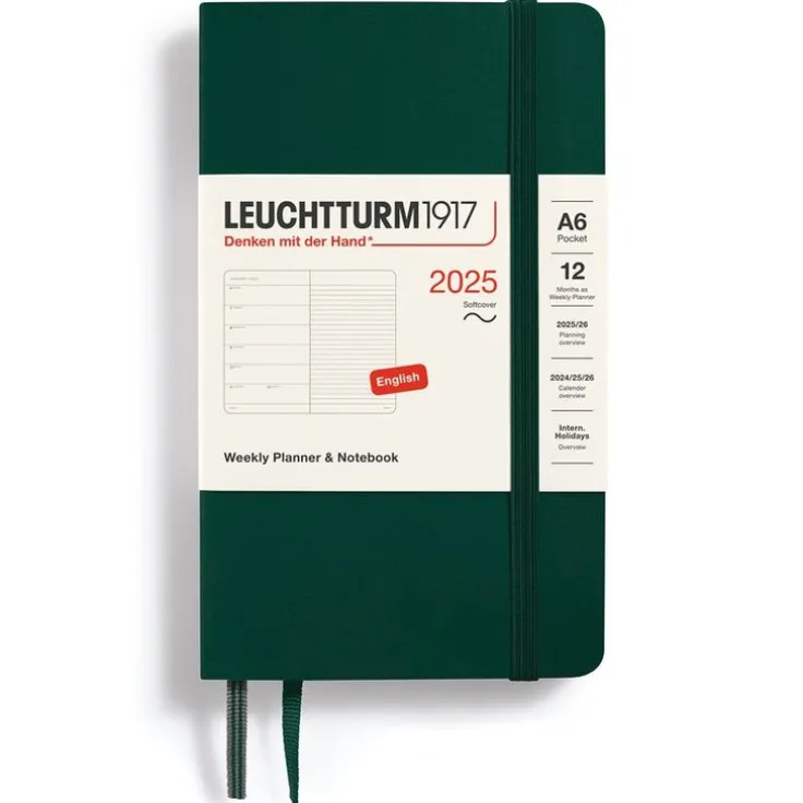 Kalender 2025 Leuchtturm1917 i A6-format med mjuk pärm, Weekly Planner & Notebook med veckans dagar på vänster sida och linjerat anteckningsblad på den högra sidan av ett uppslag – kalender och anteckningsbok i ett. Kraftig förvaringsficka längst bak. Dubbla märkband. Informationssidor med bl a internationella helgdagar i 58 länder, vilket gör det lätt att hitta helgdagar i sitt eget land, praktiskt även vid planering av resor. Projektplaneringsblad. Perforerade avrivningsbara sidor för anteckning. Praktisk resårsnodd som håller ihop kalendern. FSC-certifierat papper. Färg: Forest Green