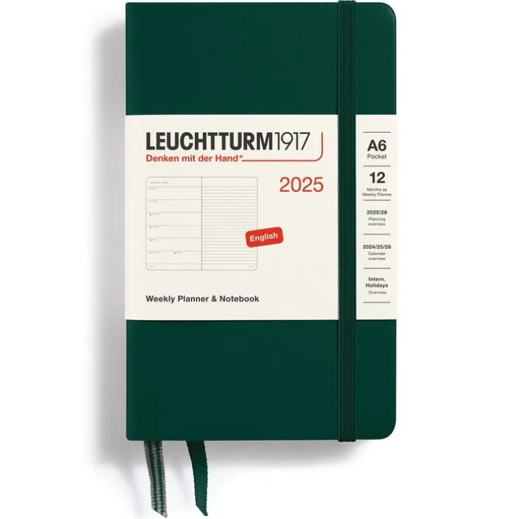 Kalender 2025 Leuchtturm1917 i A6-format med inbunden hård pärm, Weekly Planner & Notebook med veckans dagar på vänster sida och linjerat anteckningsblad på den högra sidan av ett uppslag – kalender och anteckningsbok i ett. Kalendern innehåller även separat häfte med födelsedagar, dagar att komma ihåg och adressbok. Kraftig förvaringsficka längst bak. Dubbla märkband. Informationssidor med bl a internationella helgdagar i 58 länder, vilket gör det lätt att hitta helgdagar i sitt eget land, praktiskt även vid planering av resor. Projektplaneringsblad. Perforerade avrivningsbara sidor för anteckning. Praktisk resårsnodd som håller ihop kalendern. FSC-certifierat papper. Färg: Forest Green