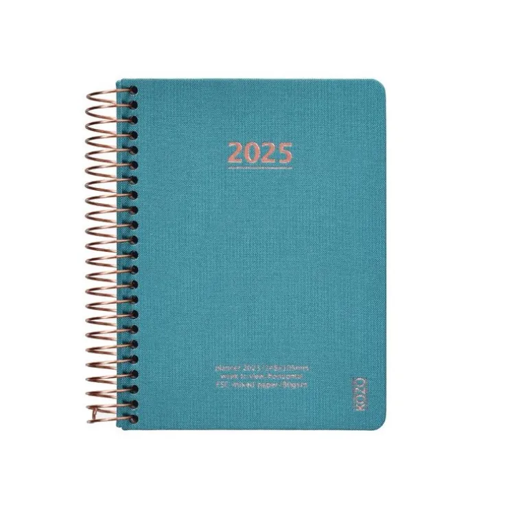 KOZO Kalender 2025 är en stilren, trespråkig årskalender som är perfekt för att organisera både jobb, skola och vardag.Det hårda omslaget och den kaxigt stora ryggspiralen gör det enkelt att öppna och skriva i kalendern även när du är på resande fot. Kalendern innehåller elegant crèmefärgat papper och är klädd i ett lyxigt canvastyg med detaljer präglade i brons.Minimalistisk liggande layout med en vecka per uppslag, där du har lika mycket plats för planering på alla veckans dagar. I varje uppslag har du dessutom plats för anteckningar och en smidig översikt över kommande veckors datum. Kalendern innehåller årsöversikter med helgdagar för 2025 och 2026 för Sverige, Danmark och Norge, årsplaneringar, plats för personlig information och linjerade sidor för egna anteckningar.Språk: Svenska, danska och norska. Kalendarium: 30 dec 2024 – 4 jan 2026. FSC-märkt papper.
